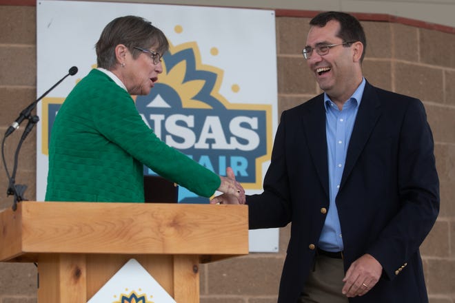 Laura Kelly makes a point during a debate with GOP. Schmidt did eventually concede the race. Governor Kansas 2022 AVG.